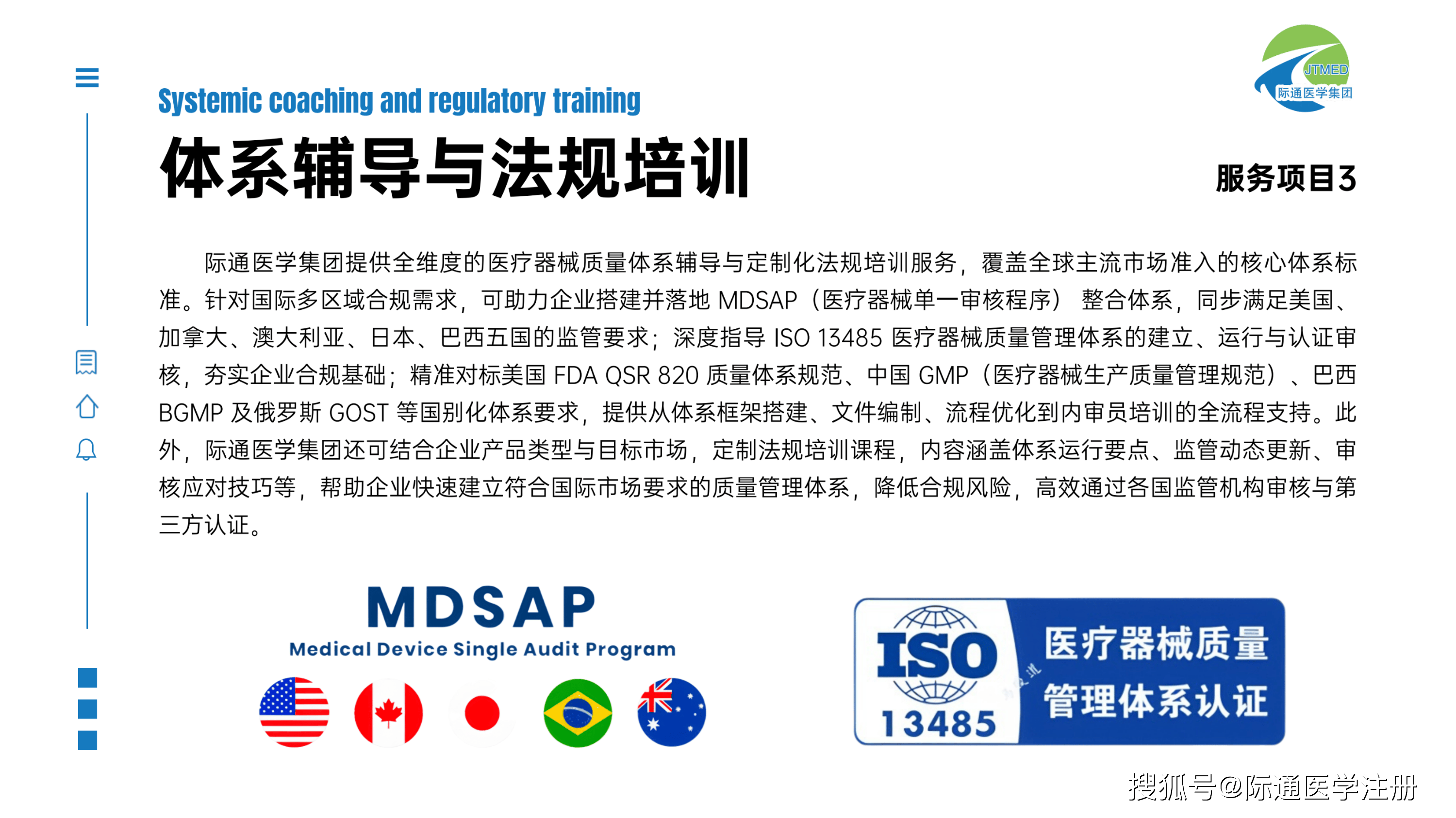 其焦点特点正在于,它将CAPA从一个孤立的“质量东西”提拔为毗连过去、现正在取将来审核的“焦点线索”。审核员通过逃踪这条线索,可以或许清晰地判断一个组织的质量系统是充满活力的自顺应系统,仍是被动的文档调集。对于企业而言,成功通过这种周期性验证,意味着成立了一套具备诊断、修复和进化功能的机制。这不只是为了满脚MDSAP的要求,更是为了正在合作激烈的全球市场中,确保产物的平安性取靠得住性,降低运营风险,并最终博得可持续的信赖。正在全链条办事能力上,际通医学实现合规办事闭环。产物测试取认证环节,笼盖安规、EMC、生物相容性(含GLP)、大动物尝试等全项查验;系统范畴,深耕MDSAP、ISO 13485、GMP等国际尺度,帮力企业搭建适配全球市场的质量办理系统。同时,供给欧代、美代、东南亚持证人等授权代表办事,配套全球临床试验手艺支撑、数据合规办理及可用性研究,高效办剃头卖证书(FSC),打通从研发到上市的每一处合规节点。正在这一闭环中,一个颠末严酷周期验证的、健壮的CAPA系统,无疑是支持整个质量办理系统不变运转、应对国际监管复杂性的基石。前往搜狐,查看更多。